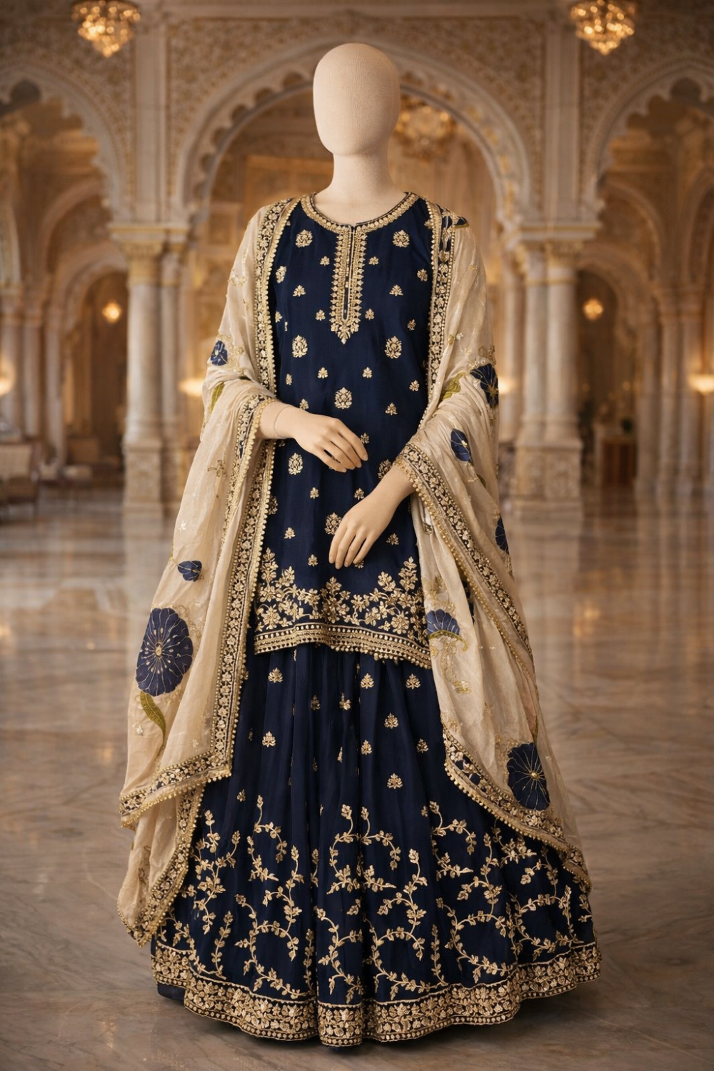Top: Chiffon Fabric embedded with Moti, Stone and Zari work (front and Back) and Full sleeves including Latkans on Daman and Sleeves