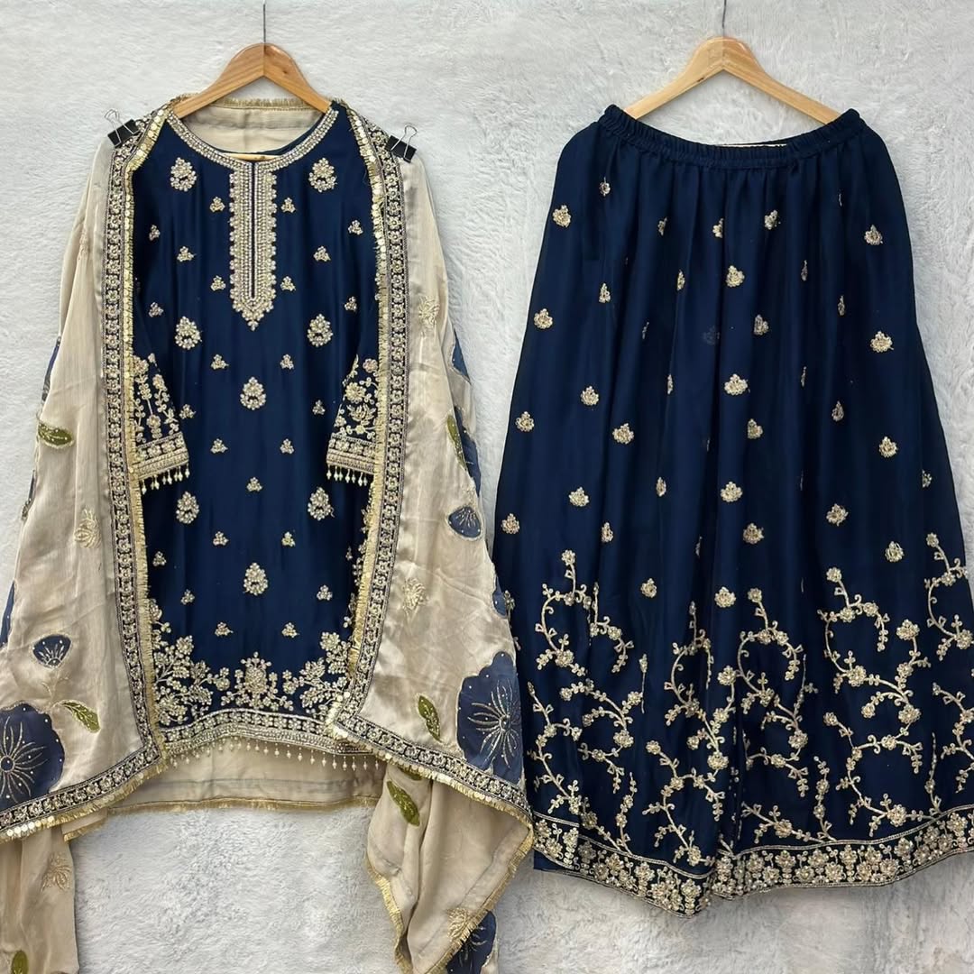 Bottom: Chiffon Fabric Full Flared Palazzos embedded with Moti, Stone and Zari work (front and Back)