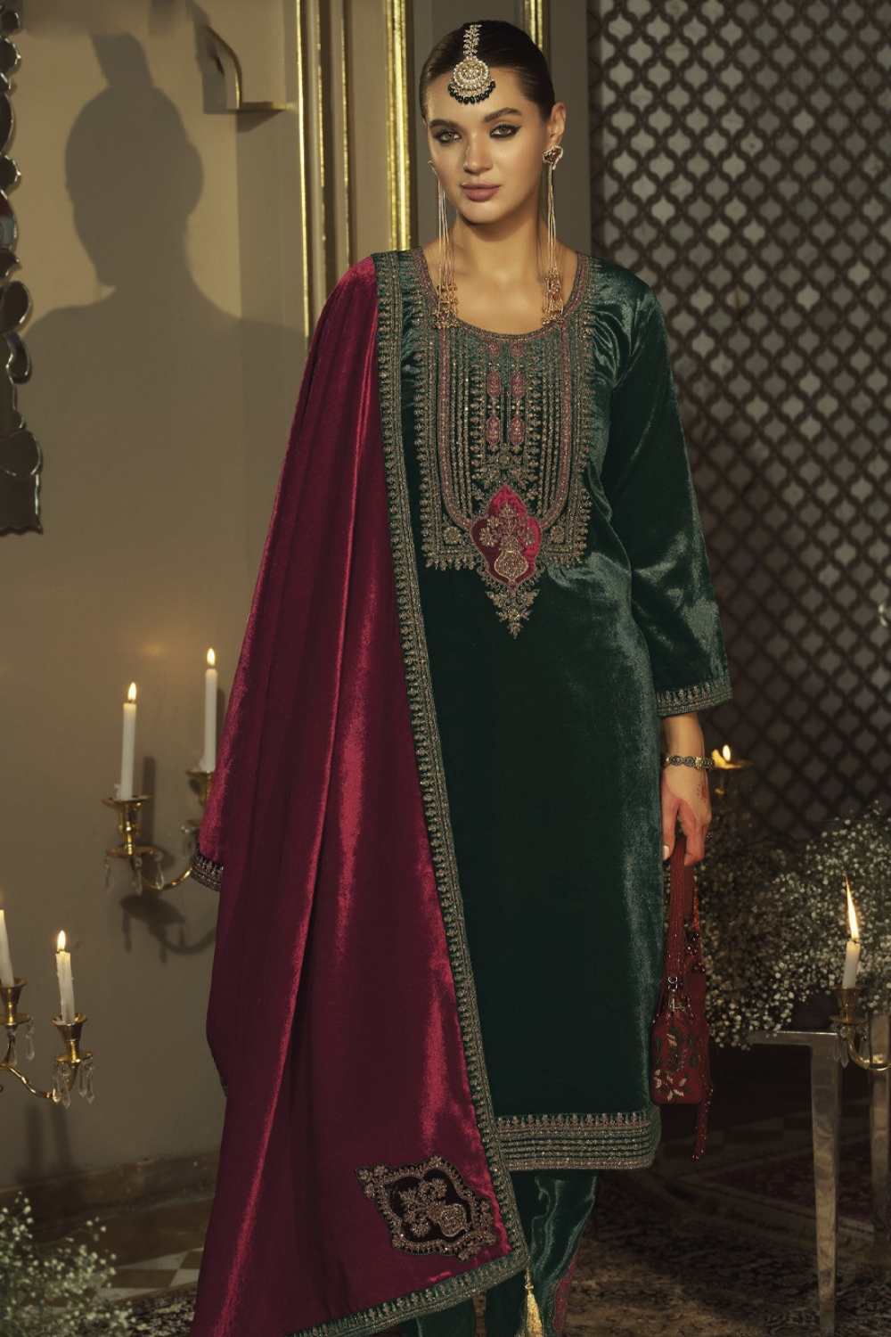 Color Combo: Bottle Green with Royal Maroon Dupatta